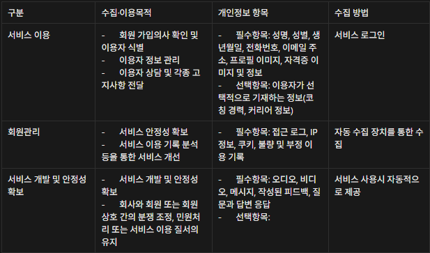 “회사”는 다음과 같은 목적으로 서비스 제공 및 이용을 위하여 필요한 범위에서 최소한의 개인정보만을 수집하며 수집된 개인정보는 목적 이외의 용도로는 사용되지 않습니다. 이용 목적이 변경되는 경우에는 「개인정보보호법」 제18조에 따라 별도의 동의를 받는 등 필요한 조치를 이행할 예정입니다. 이와 같이 수집되는 정보는 개인정보와의 연계 여부 등에 따라 개인정보에 해당할 수 있고, 개인정보에 해당하지 않을 수도 있습니다.